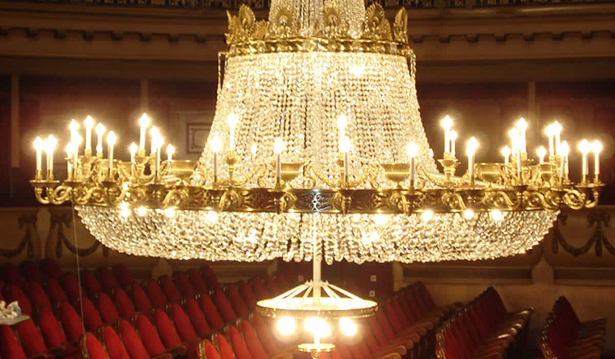 Restauramos la gran lámpara del patio de butacas del Teatro Campoamor (Oviedo), una pieza de estilo Imperio de aprox. 4 m de diámetro por 6 m de altura, datada a finales del s. XIX–inicio del XX. Sin firma, pero por calidad y materiales apunta a origen francés o italiano; está realizada en bronce a la cera perdida con cadenetas de cristal che