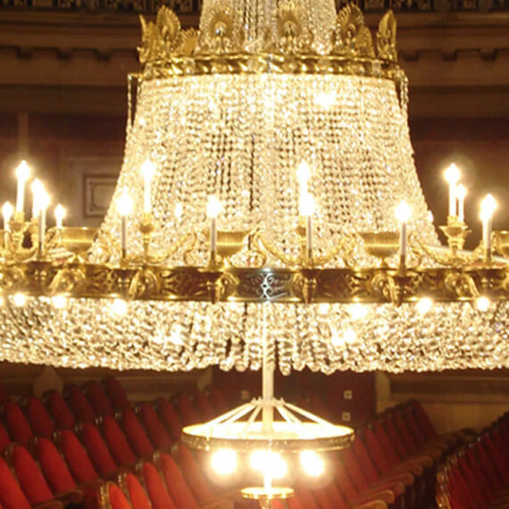 Restauramos la gran lámpara del patio de butacas del Teatro Campoamor (Oviedo), una pieza de estilo Imperio de aprox. 4 m de diámetro por 6 m de altura, datada a finales del s. XIX–inicio del XX. Sin firma, pero por calidad y materiales apunta a origen francés o italiano; está realizada en bronce a la cera perdida con cadenetas de cristal checo y armadura interna de hierro.