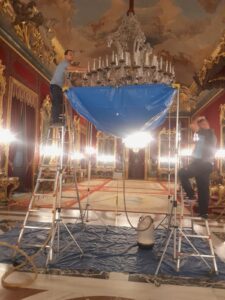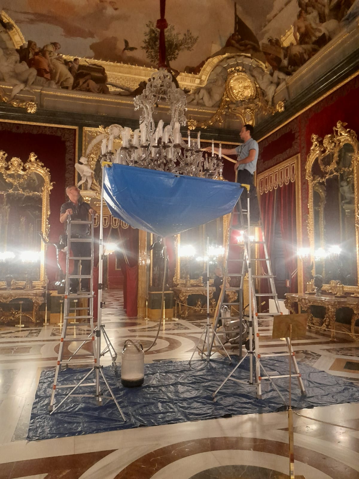 CLEANERLAMP, está ultimando la limpieza de las lámparas de este emblemático emplazamiento, así como de otros salones del Palacio como el Comedor de Gala, para que luzcan en todo su esplendor.